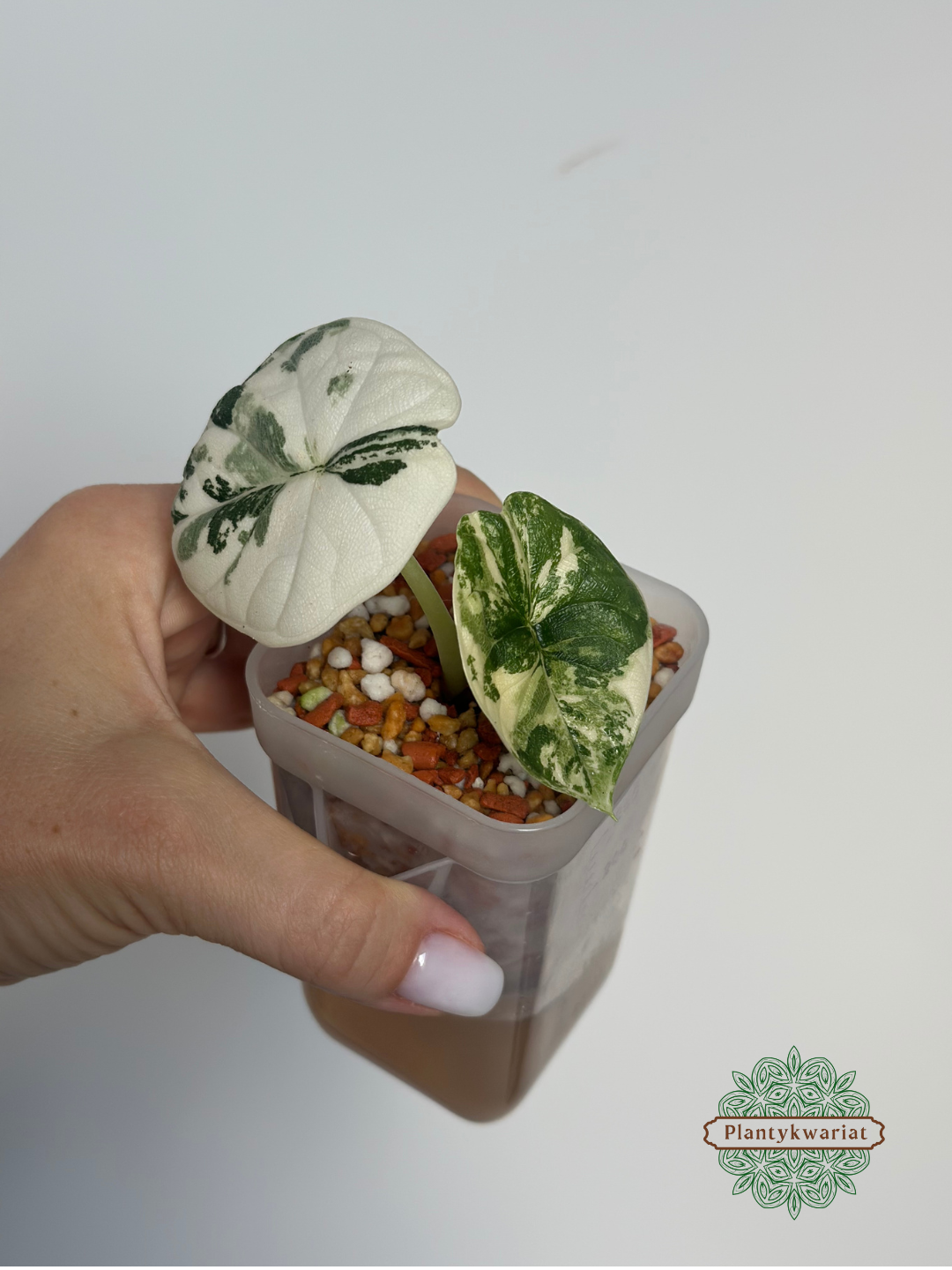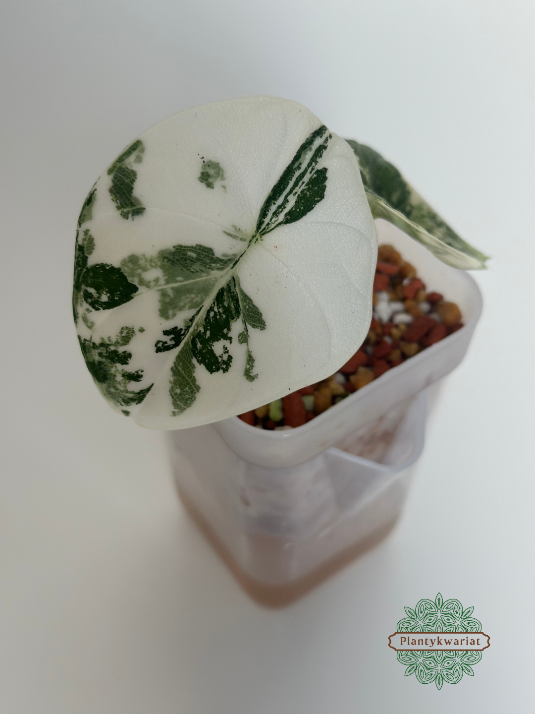 Alocasia Melo Albo Variegata to wyjątkowa, kolekcjonerska forma cenionej alokazji melo. Jej charakterystyczne, grube i mocno fakturowane liście ukazują spektakularną, białą oraz jasnozieloną wariegację – każdy egzemplarz prezentuje niepowtarzalny, marmurkowy rysunek i kontrast między śnieżnobiałą a głęboko zieloną tkanką. Powierzchnia liści jest niemal skórzasta, mięsista i przy dotyku lekko chropowata. Alocasia melo wywodzi się z tropikalnych lasów Borneo, gdzie zasiedla skaliste zbocza w miejscach o wysokiej wilgotności.