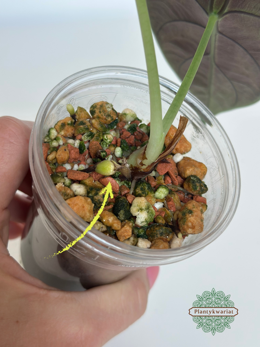 Umieszczona w kubeczku/doniczce z rezerwuarem wody, co ułatwia kontrolę poziomu roztworu odżywczego i minimalizuje ryzyko przelania wrażliwego systemu korzeniowego alokazji.