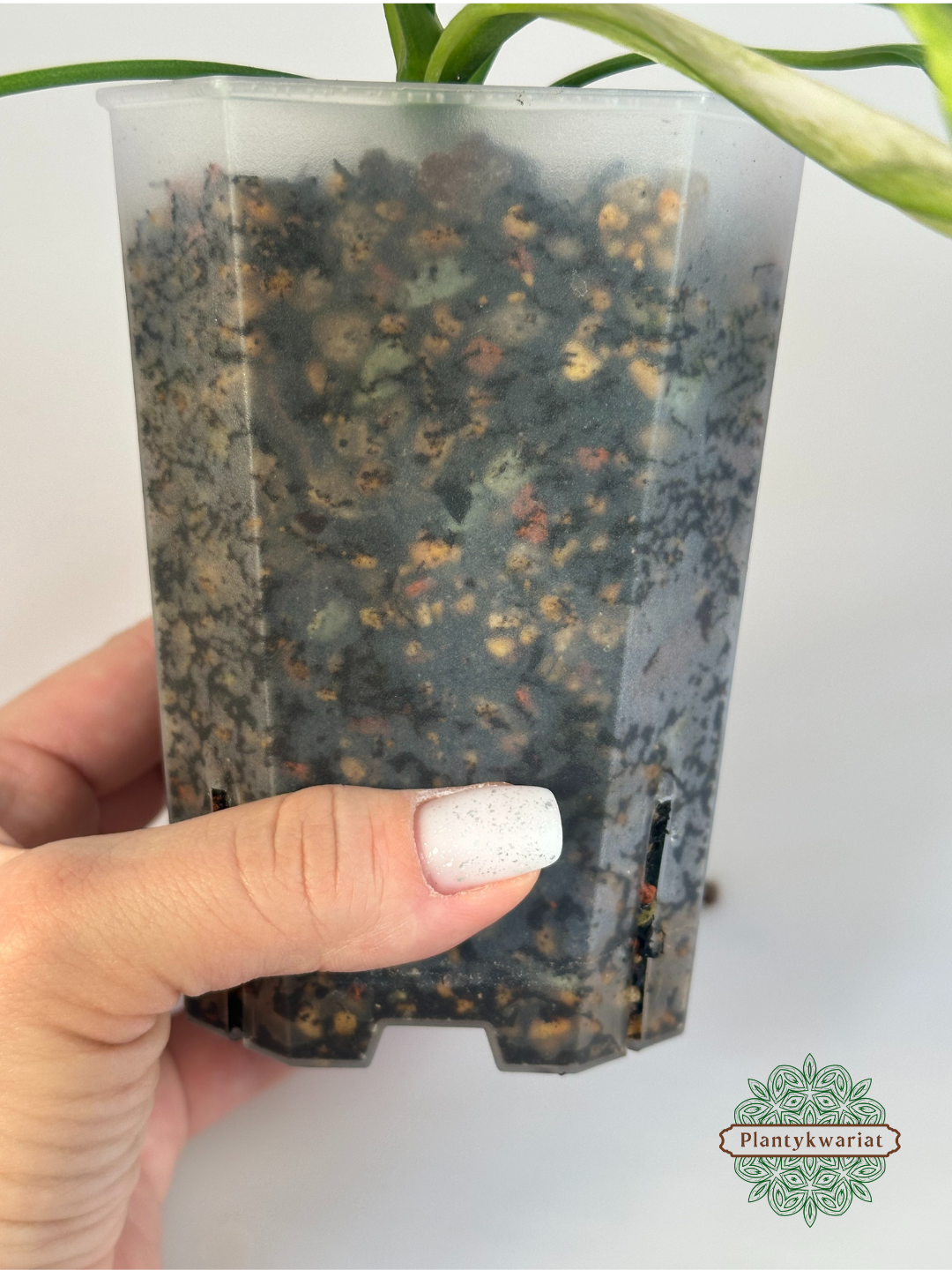 Sadzonka jest zdrowa, aktywnie rosnąca, z kilkoma długimi, dobrze wybarwionymi liśćmi z wyraźną variegacją.