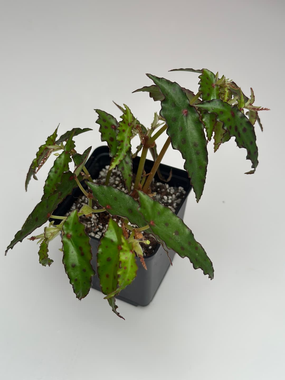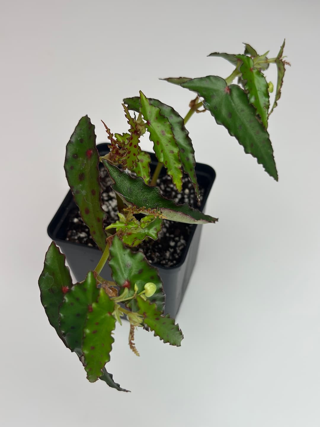 Begonia amphioxus roślina o wąskich, podłużnych, jasnozielonych liściach z intensywnymi czerwonymi plamkami i bordowymi brzegami. Pokrój jest zwarty i elegancki, a prześwitujące liście dają wyjątkowy efekt „żywego dzieła sztuki”. Gatunek pochodzi z wilgotnych lasów tropikalnych Borneo (Sabah, Malezja), gdzie rośnie na wapiennych zboczach i wśród skalnych szczelin. W warunkach domowych dorasta do ok. 30–40 cm wysokości.